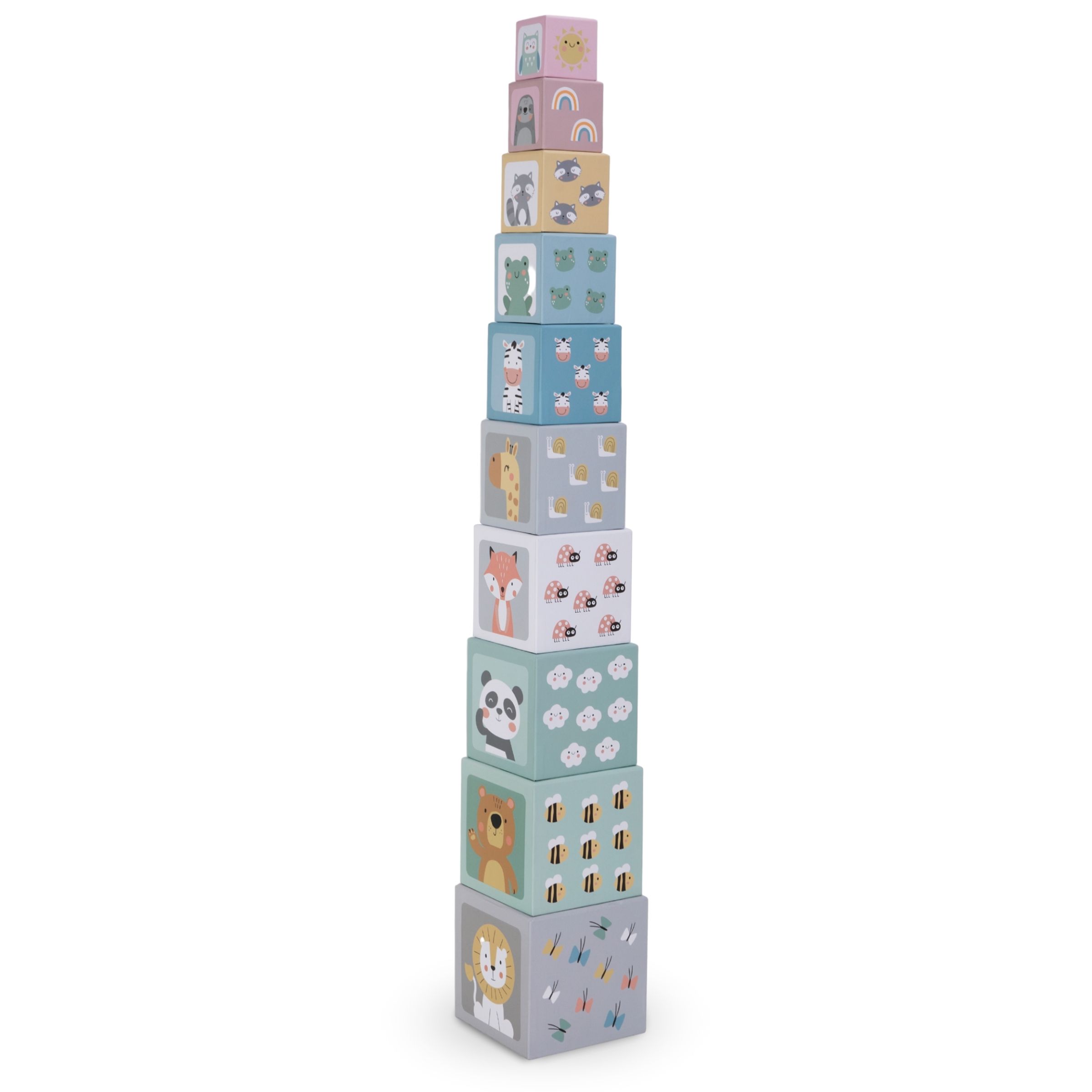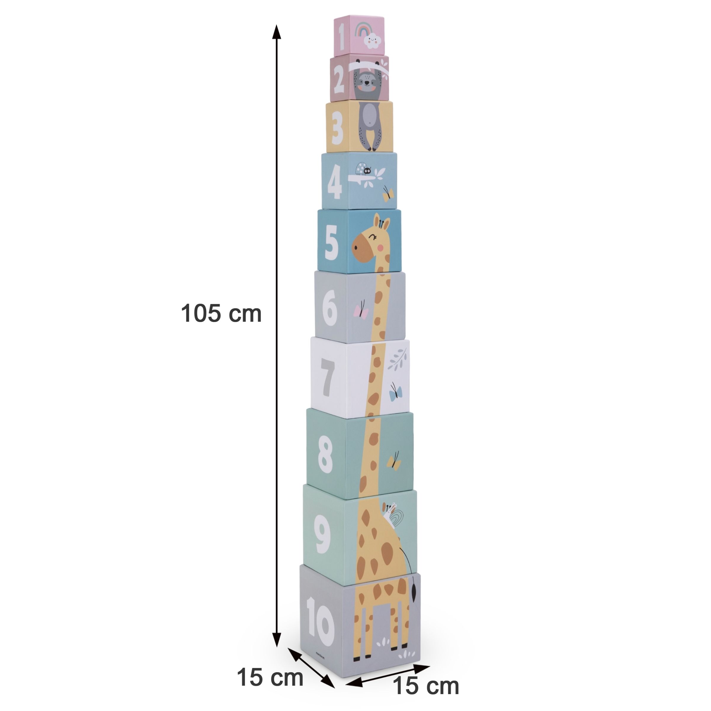 Ο πύργος στοίβαξης αποτελείται από 10 κύβους από χαρτόνι διαφορετικών μεγεθών. Όλοι οι τοίχοι τους έχουν διακοσμηθεί με ένα πολύχρωμο, εντυπωσιακό τύπωμα. Το νήπιο μπορεί να στοιβάζει τους κύβους ο ένας πάνω στον άλλο και στη συνέχεια να γκρεμίζει τον πύργο που έχει χτίσει, κάτι που σίγουρα θα του προσφέρει πολλή διασκέδαση. Τα πολύχρωμα τουβλάκια θα αποτελέσουν αναμφίβολα τη διακόσμηση του παιδικού δωματίου. Χάρη στον σχεδιασμό τους, θα προσελκύσουν αποτελεσματικά την προσοχή του νηπίου.
