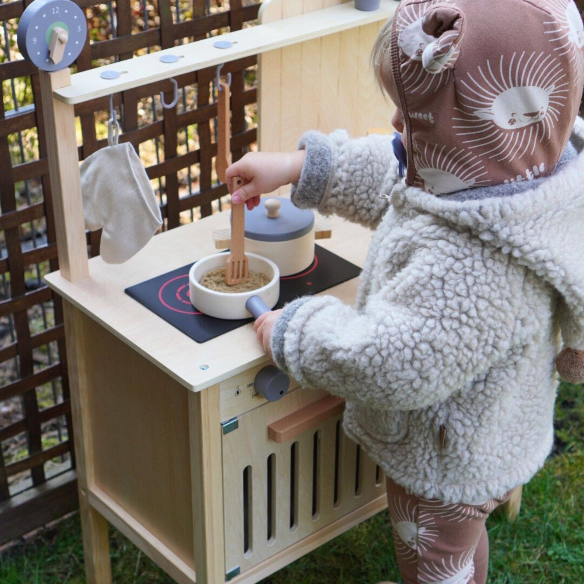 Η μίμηση των ενηλίκων είναι φανταστική διασκέδαση για τα παιδιά! Η ξύλινη κουζίνα θα τους επιτρέψει να αναλάβουν το ρόλο ενός επαγγελματία σεφ ή της μαμάς ή του μπαμπά που ετοιμάζουν το οικογενειακό γεύμα. Το παιχνίδι μπορεί επίσης να χρησιμοποιηθεί από τα νήπια για να παίξουν εστιατόριο ή κατάστημα. Μπορεί να χρησιμοποιηθεί με πολλούς διαφορετικούς τρόπους και η δημιουργική διασκέδαση δεν έχει τέλος!