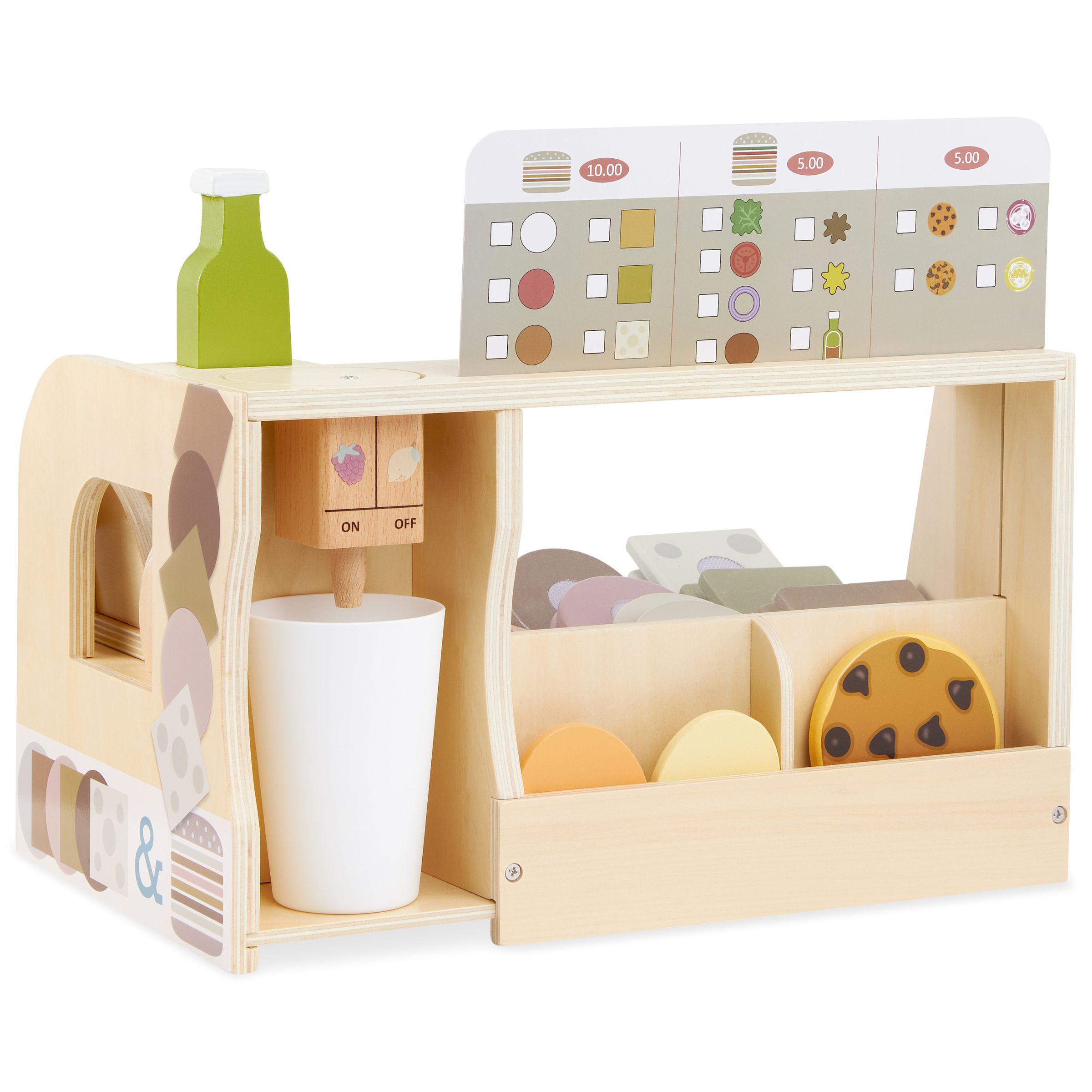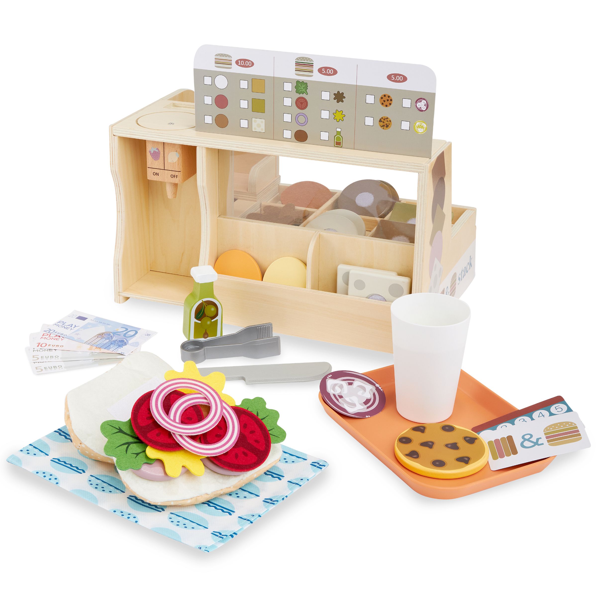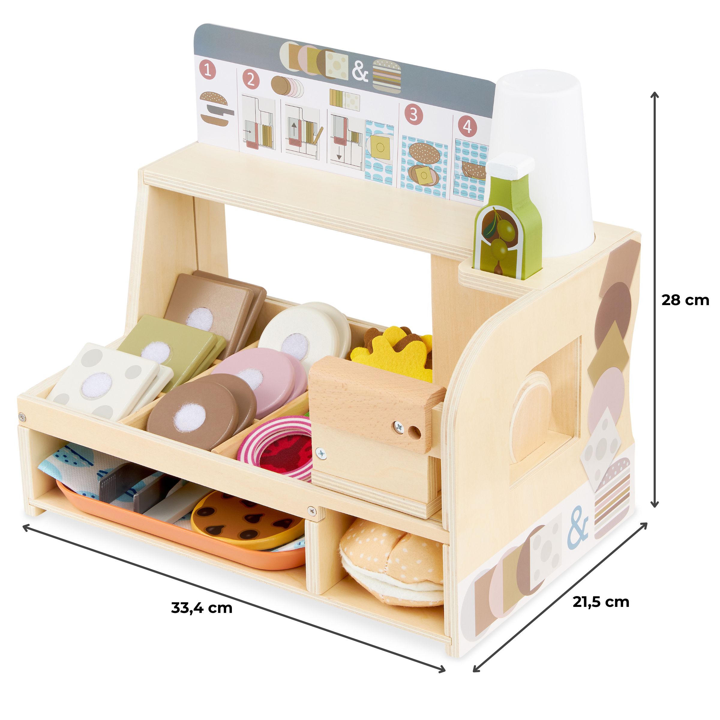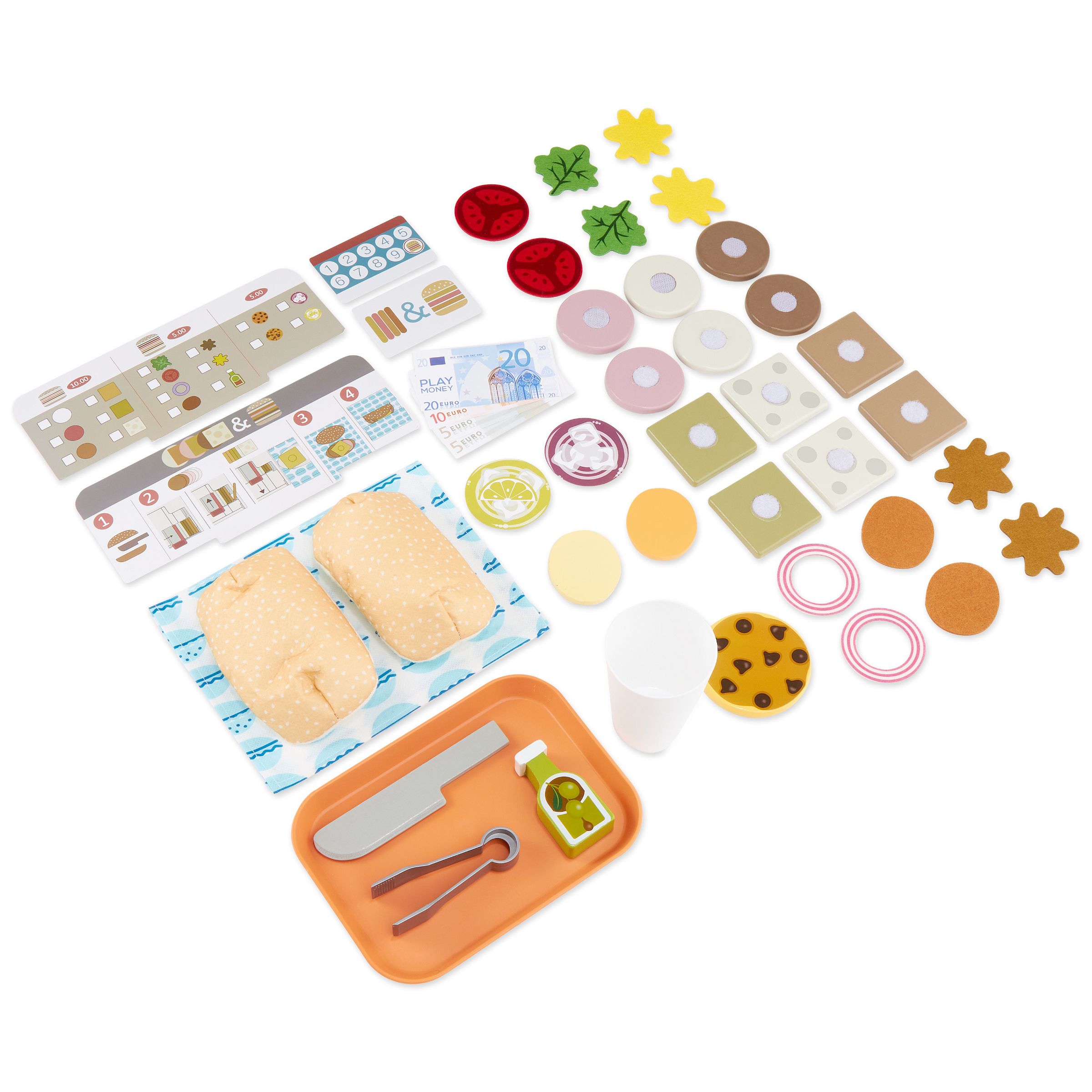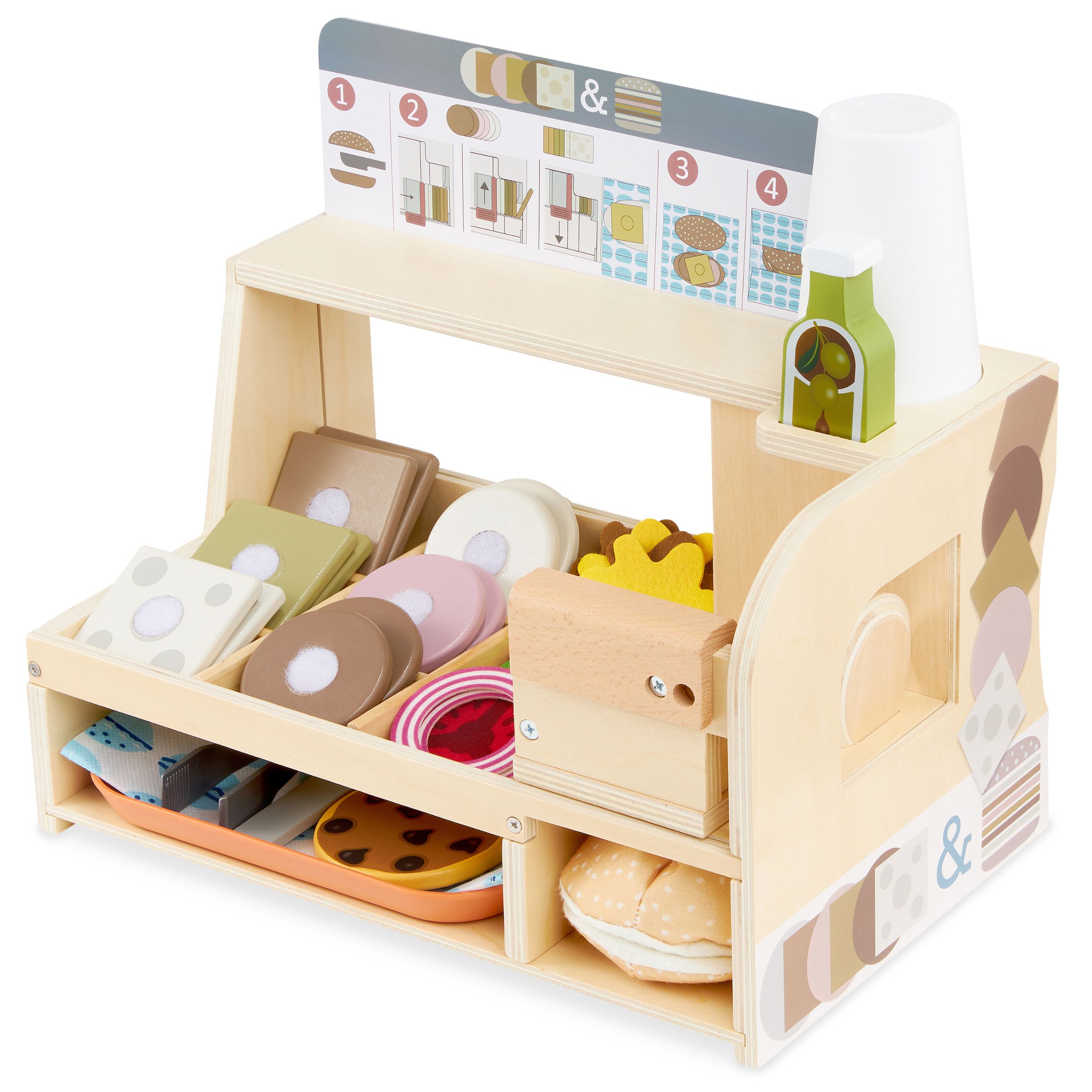 Με αυτό το παιχνίδι εξοπλισμένο με πολυάριθμα αξεσουάρ, το παιδί σας θα μπορέσει να αναλάβει το ρόλο ενός φρέσκου και πολύχρωμου πωλητή σάντουιτς. Γιατί η μπάρα σάντουιτς, κατασκευασμένη από ανθεκτικό ξύλο, περιέχει όλα όσα χρειάζονται για την προετοιμασία τους. Ένα πραγματικό highlight είναι ο κινητός κόφτης, ο οποίος επιτρέπει στο παιδί σας να "κόβει" τυρί ή κρέας. Τα υλικά του σάντουιτς διαθέτουν Velcro, ώστε να μπορείτε εύκολα να συνθέσετε ένα νόστιμο σάντουιτς. Τώρα το μόνο που χρειάζεστε είναι ένα ποτό και ένα νόστιμο γεύμα είναι έτοιμο!