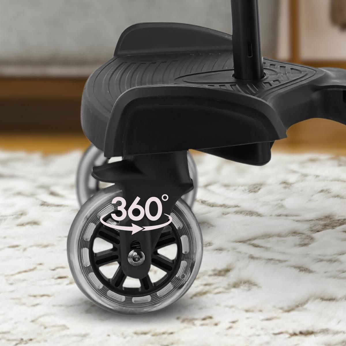 Αυτό το αξεσουάρ καροτσιού ταιριάζει σε όλα τα τυποποιημένα καροτσάκια της αγοράς. Αυτό οφείλεται στο γεγονός ότι διαθέτει ένα καθολικό σύστημα προσάρτησης που το συνδέει τόσο σε κάθετα όσο και σε οριζόντια πλαίσια. Η μαλακή ανάρτηση εγγυάται μια ομαλή και άνετη διαδρομή και η αντιολισθητική πλατφόρμα αυξάνει την ασφάλειά του. Το πρόσθετο έχει σχεδιαστεί για παιδιά ηλικίας από 2 έως περίπου 5 ετών. Οι ρόδες περιστρέφονται κατά 360 μοίρες για εύκολη οδήγηση. Το άνετο κάθισμα, από την άλλη πλευρά, εγγυάται την άνεση του παιδιού κατά τη διάρκεια της διαδρομής.