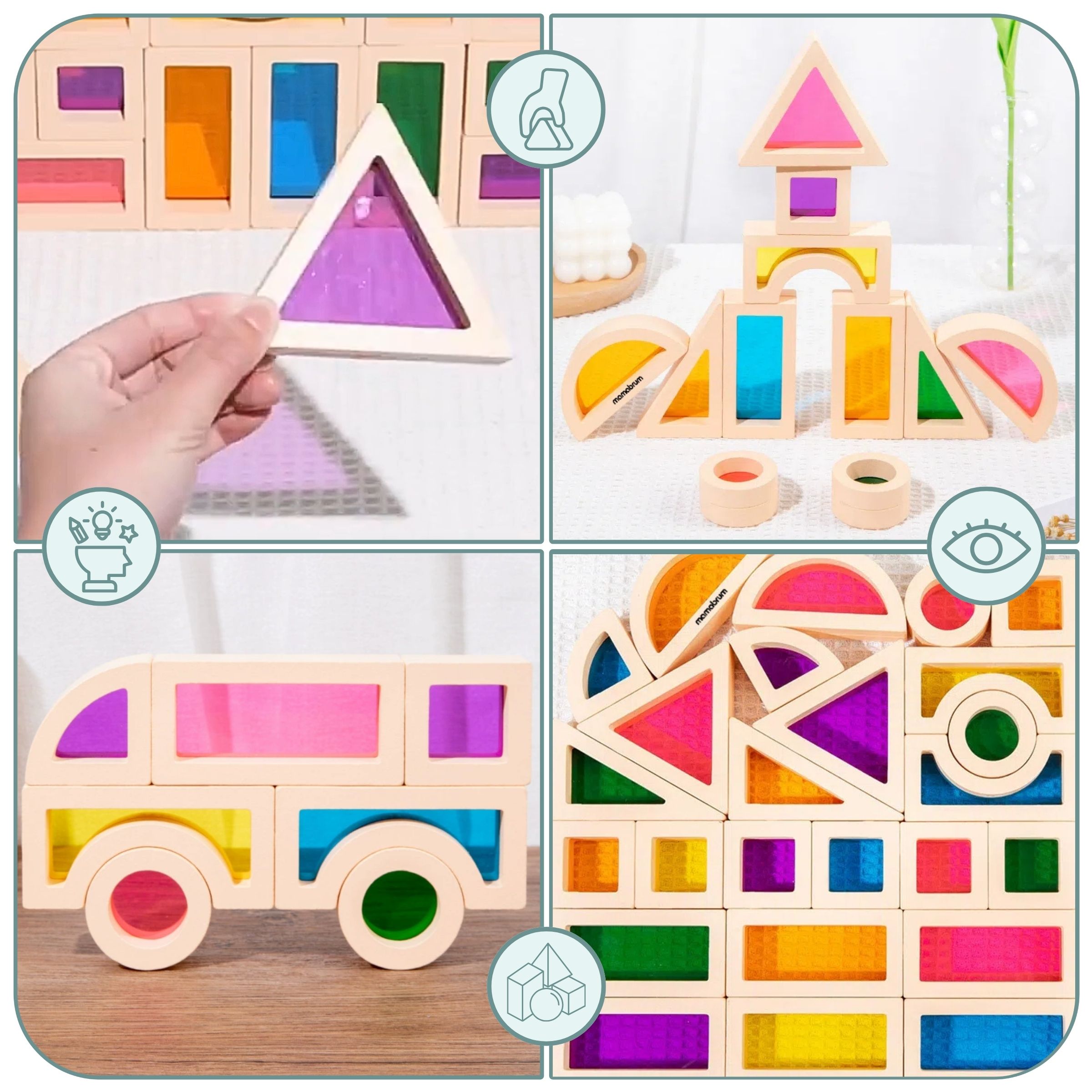 Το σετ περιέχει έως και 25 στοιχεία με καθρέφτες διαφορετικού σχήματος και χρώματος. Τα παράθυρα παίρνουν διαφορετικές αποχρώσεις, ανάλογα με την ένταση του φωτός και τον αριθμό των τεμαχίων που τοποθετούνται πάνω τους. Πρόκειται για φανταστική διασκέδαση και επίσης για μια εξαιρετική εισαγωγή στην εκμάθηση των χρωμάτων και των βασικών σχημάτων, όπως το τετράγωνο, το ορθογώνιο, το τρίγωνο και ο κύκλος. Με τα τουβλάκια ουράνιου τόξου, ένα νήπιο μπορεί να ανακαλύψει τον κόσμο των χρωμάτων και να χαρεί από αυτόν. Τα τουβλάκια μπορούν να χρησιμοποιηθούν τόσο ως πηγή ψυχαγωγίας όσο και για μάθηση.