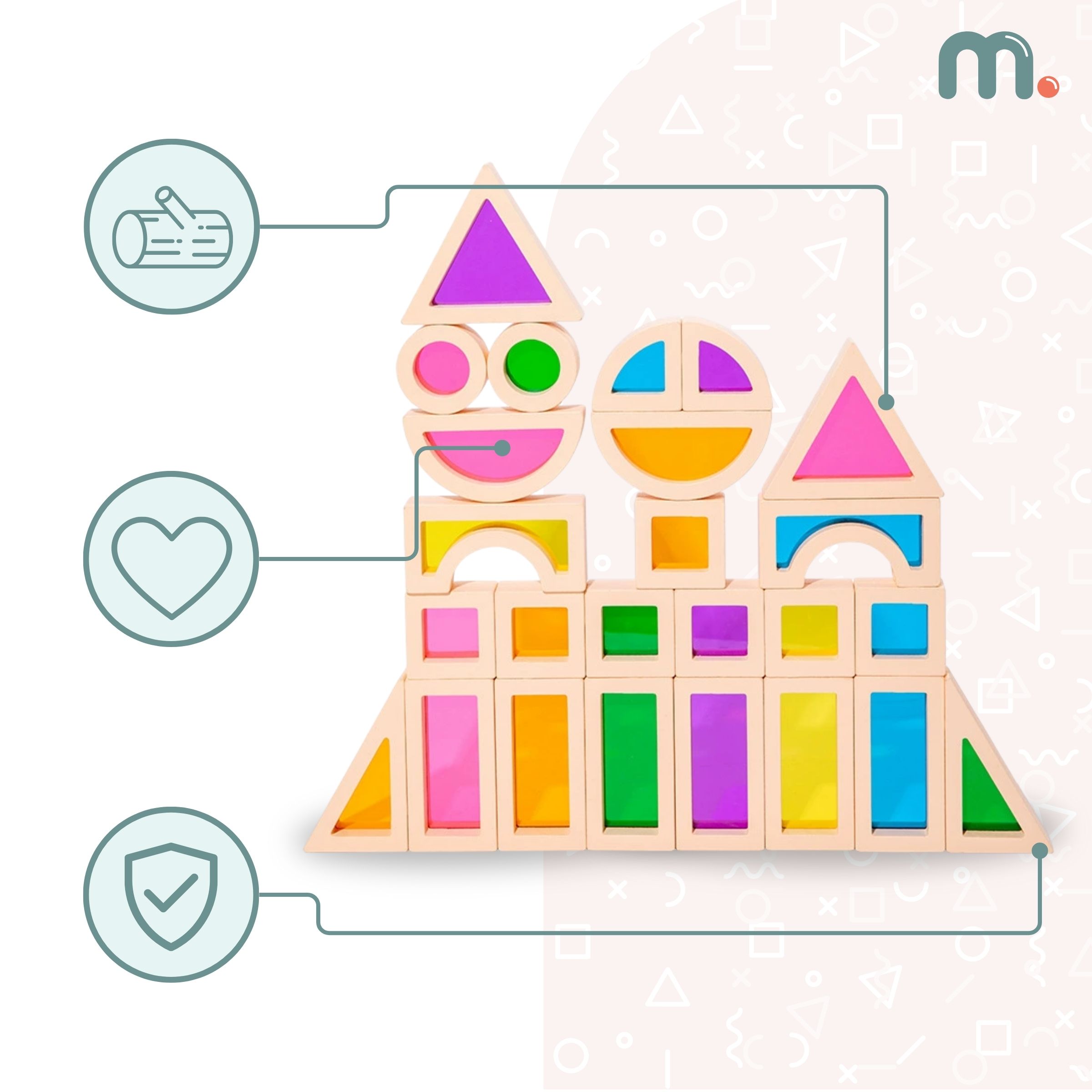 Τα ξύλινα τουβλάκια με τα πολύχρωμα καθρεφτάκια αποτελούν εγγύηση φανταστικής διασκέδασης για κάθε νήπιο! Μπορούν να χρησιμοποιηθούν για να δημιουργήσουν κάθε είδους κατασκευές και ταυτόχρονα να παρατηρήσουν το πολύχρωμο αποτέλεσμα των ημιδιαφανών πλακών στο εσωτερικό των παραθύρων.