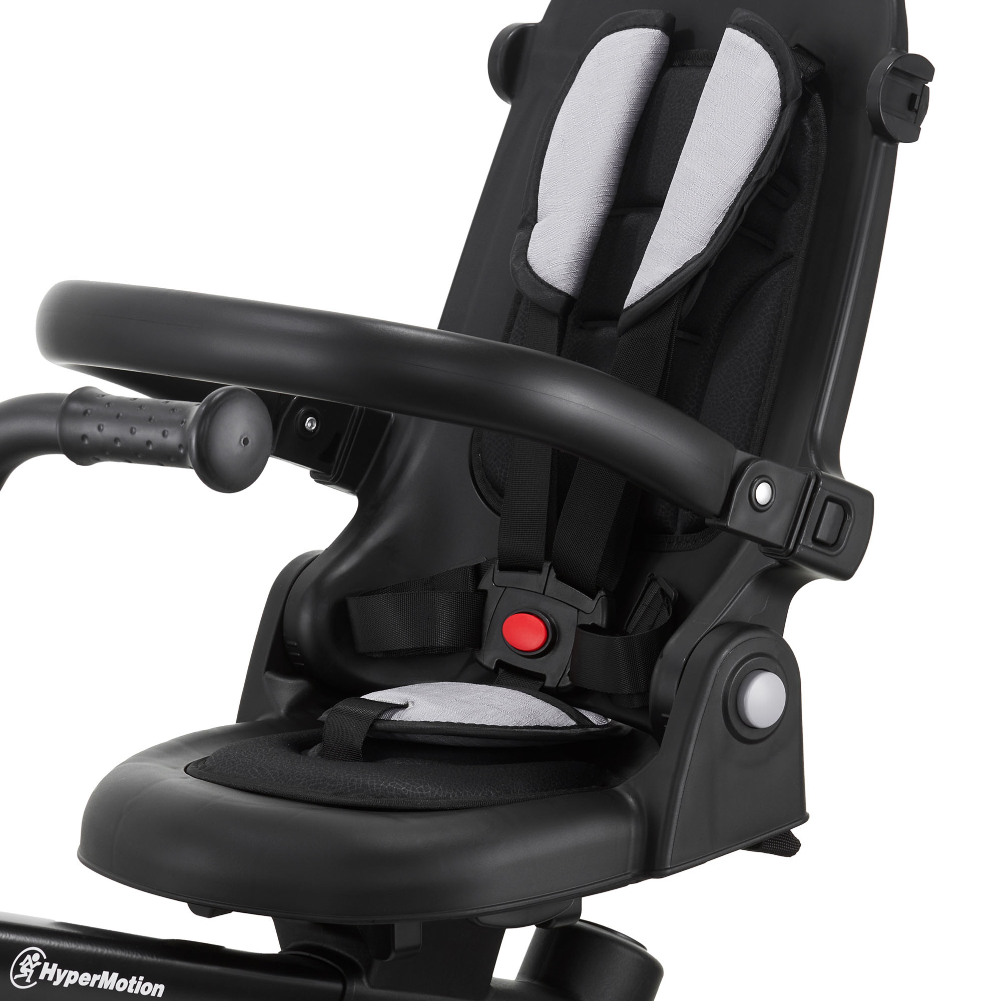 Επίσης, το τιμόνι με ρυθμιζόμενη γωνία (από μπροστά προς τα πίσω) επιτρέπει την τέλεια προσαρμογή της θέσης των χειρολαβών στο παιδί, ενώ το περιστρεφόμενο κατά 360° κάθισμα επιτρέπει την οδήγηση τόσο προς τα εμπρός όσο και προς τα πίσω για τον γονέα.