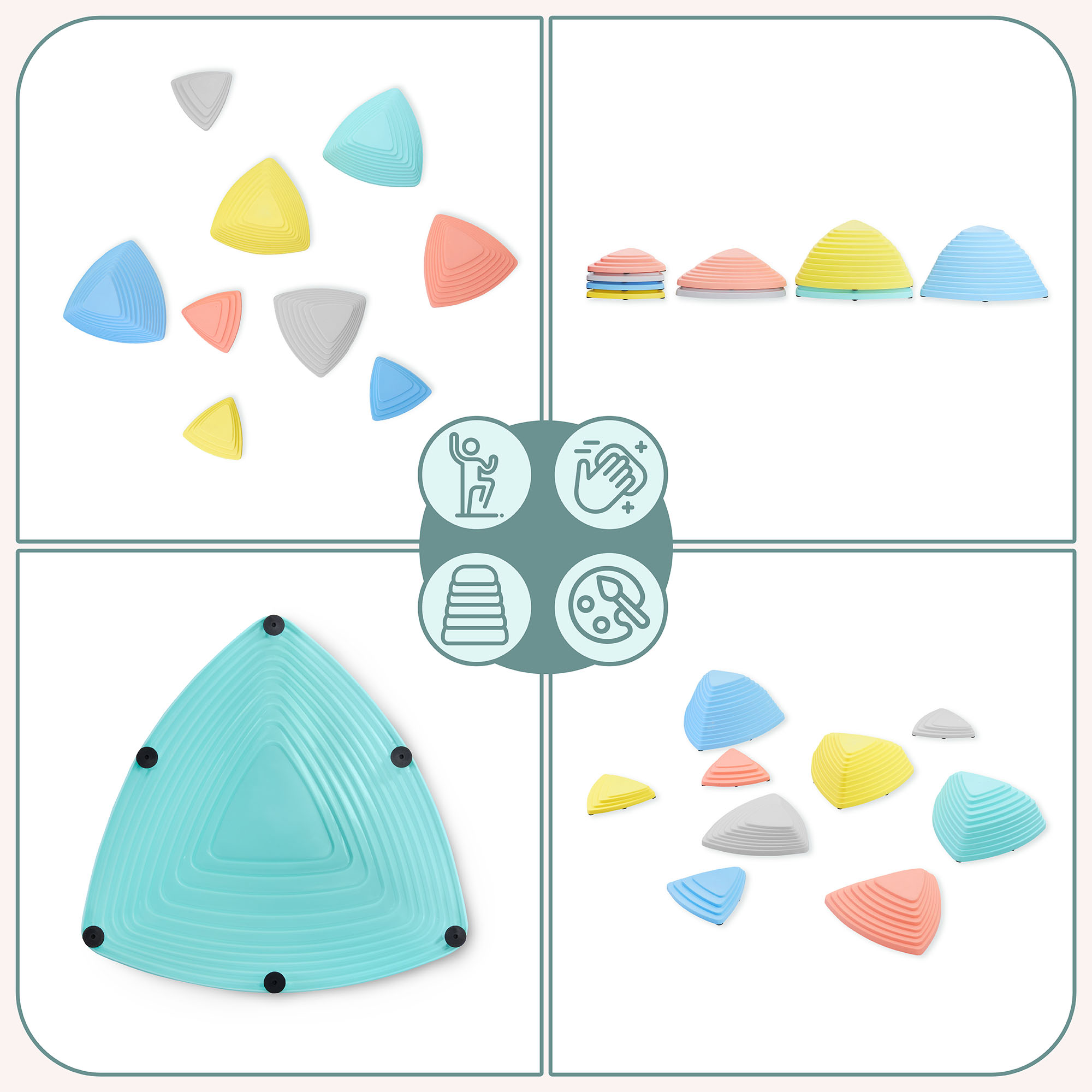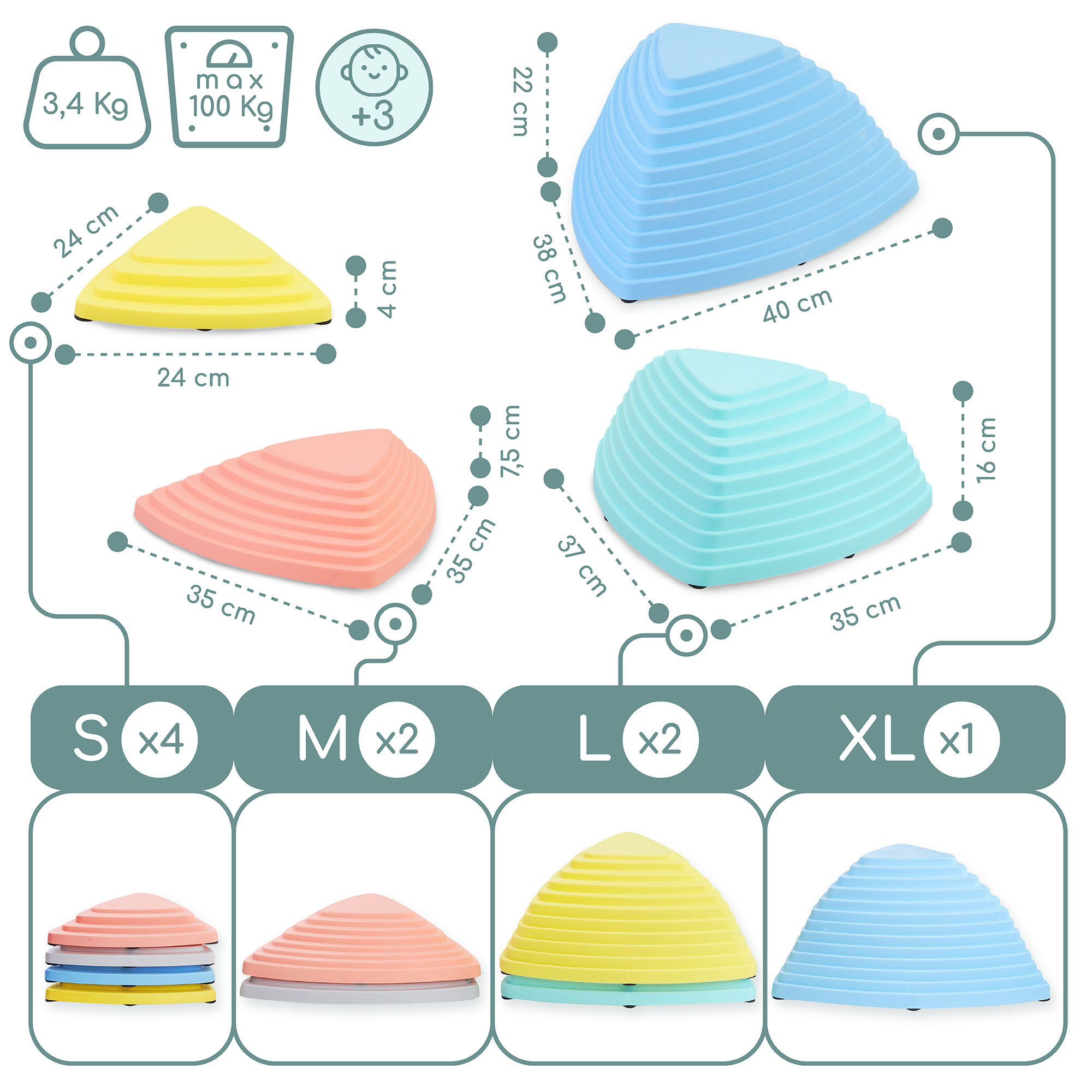 Το σετ με πέτρες ισορροπίας περιλαμβάνει 9 κομμάτια σε διάφορα μεγέθη και χρώματα. Απλά τοποθετήστε τις σε μια συγκεκριμένη απόσταση η μία από την άλλη για να προσφέρετε στο μικρό σας παιδί συναρπαστική ψυχαγωγία. Η ισορροπία πάνω σε μια σειρά από πέτρες είναι μια εξαιρετική προπόνηση για την ισορροπία και εξασκεί τον κινητικό συντονισμό. Το σετ αποτελεί εξαιρετική επιλογή όχι μόνο για το σπίτι, αλλά και για το παιδικό δωμάτιο ή το δωμάτιο αποκατάστασης.