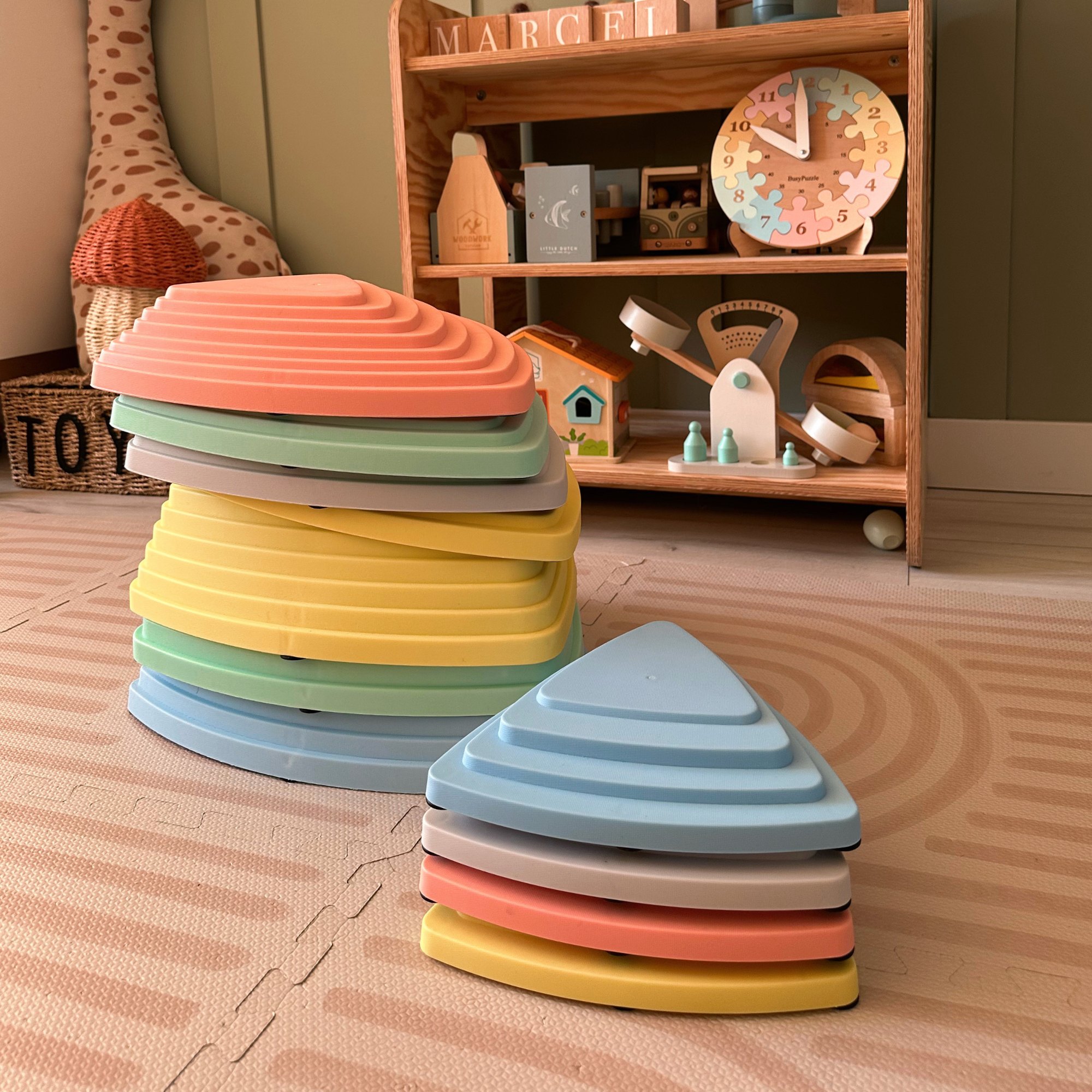 Διαθέσιμο σε παστέλ χρώματα, το σετ από πέτρες ισορροπίας όχι μόνο διακοσμεί το παιδικό δωμάτιο, αλλά κυρίως προσφέρει δημιουργική ψυχαγωγία. Οι πέτρες μπορούν να χρησιμοποιηθούν με πολλούς διαφορετικούς τρόπους, ανάλογα με τις τρέχουσες ανάγκες και ιδέες των παιδιών. Οι πέτρες ισορροπίας υποστηρίζουν επίσης την κινητική ανάπτυξη των νηπίων και τους δίνουν την ευκαιρία να εξασκήσουν την αίσθηση της ισορροπίας τους.