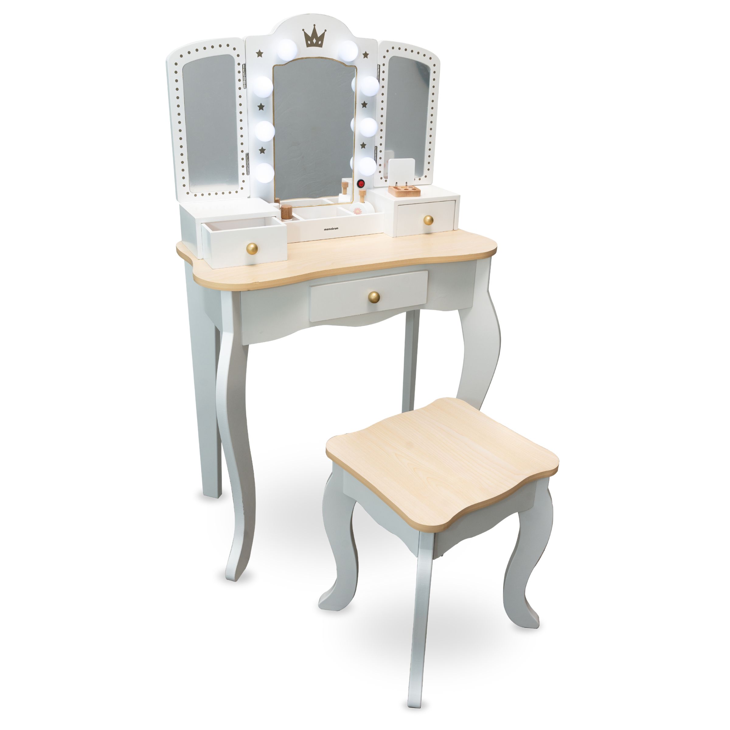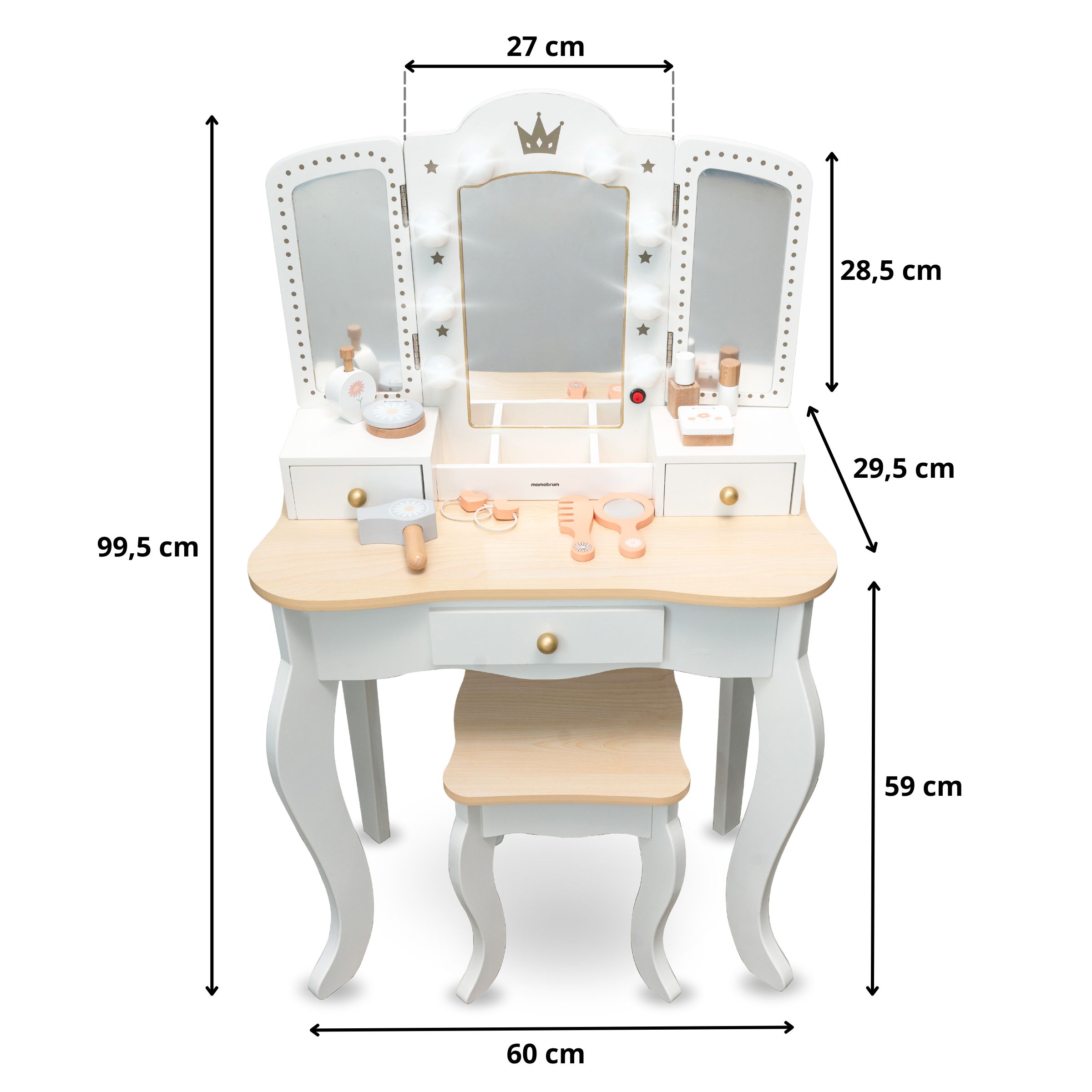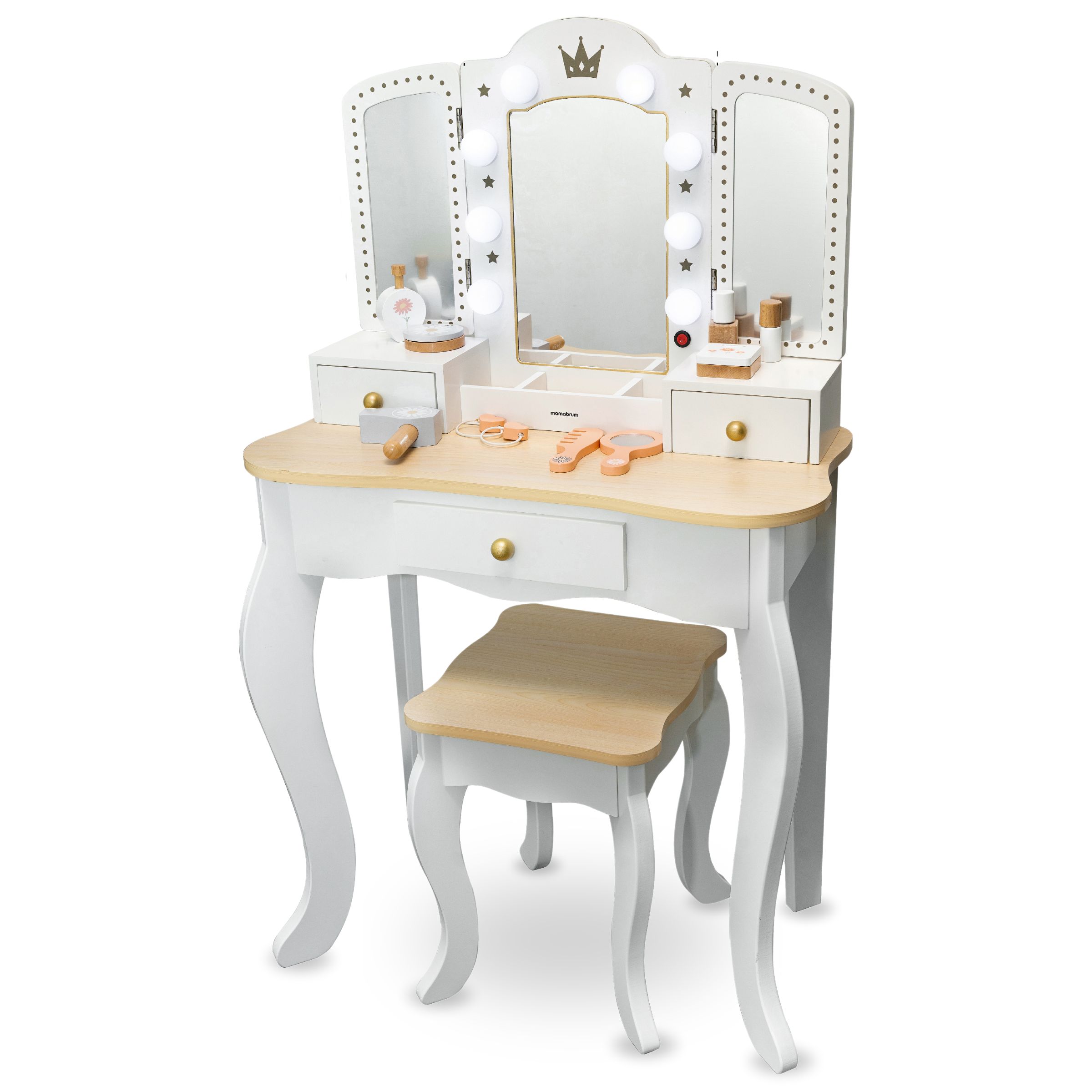 Ατμοσφαιρικός, απαλός φωτισμός παρέχεται από 8 λαμπτήρες LED. Ο καθρέφτης μπορεί να αφαιρεθεί, μετατρέποντας το κομοδίνο σε ένα μικρό γραφείο. Για να δείτε το πρόσωπό σας από διαφορετική γωνία, απλά ρυθμίστε τους πλευρικούς καθρέφτες. Το ξύλινο κομοδίνο αποτελεί μια μοναδική ιδέα δώρου για το μικρό σας!