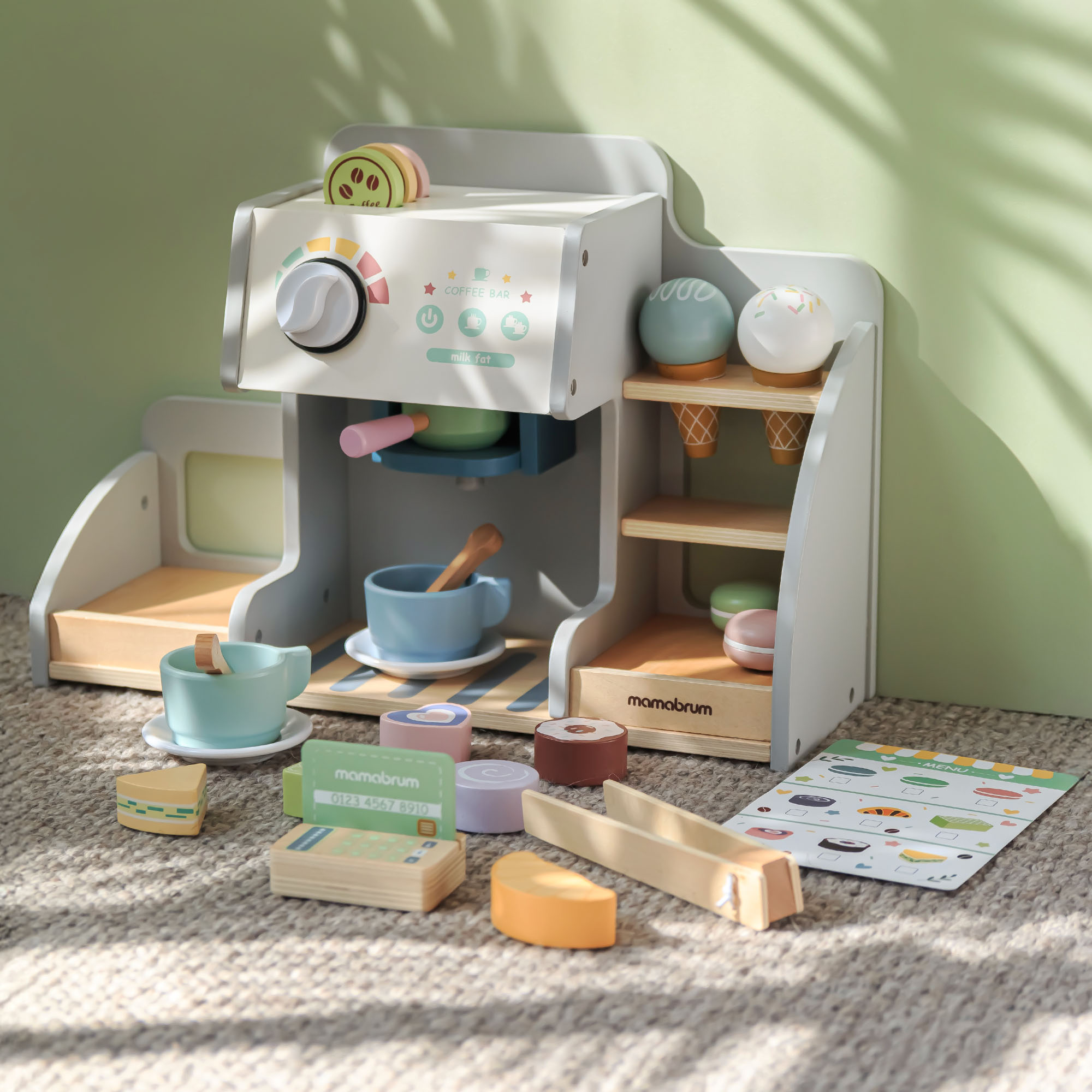Αυτό το υπέροχα κατασκευασμένο ξύλινο σετ θα μεταφέρει το μικρό σας σε έναν κόσμο αρωματικών ποτών και γλυκών λιχουδιών! Το παιδί σας μπορεί να ετοιμάσει καφέ, να σερβίρει παγωτό και να λάβει πληρωμή - και στη συνέχεια να τα επαναλάβει όλα αυτά σε ένα νέο σενάριο παιχνιδιού. Το εκτεταμένο σετ αξεσουάρ σας επιτρέπει να δημιουργήσετε τα δικά σας μενού και να περάσετε ώρες διασκέδασης με παιχνίδια ρόλων. Το παιχνίδι μπαρίστα αναπτύσσει τη δημιουργικότητα και την επιδεξιότητα των μικρών χεριών.