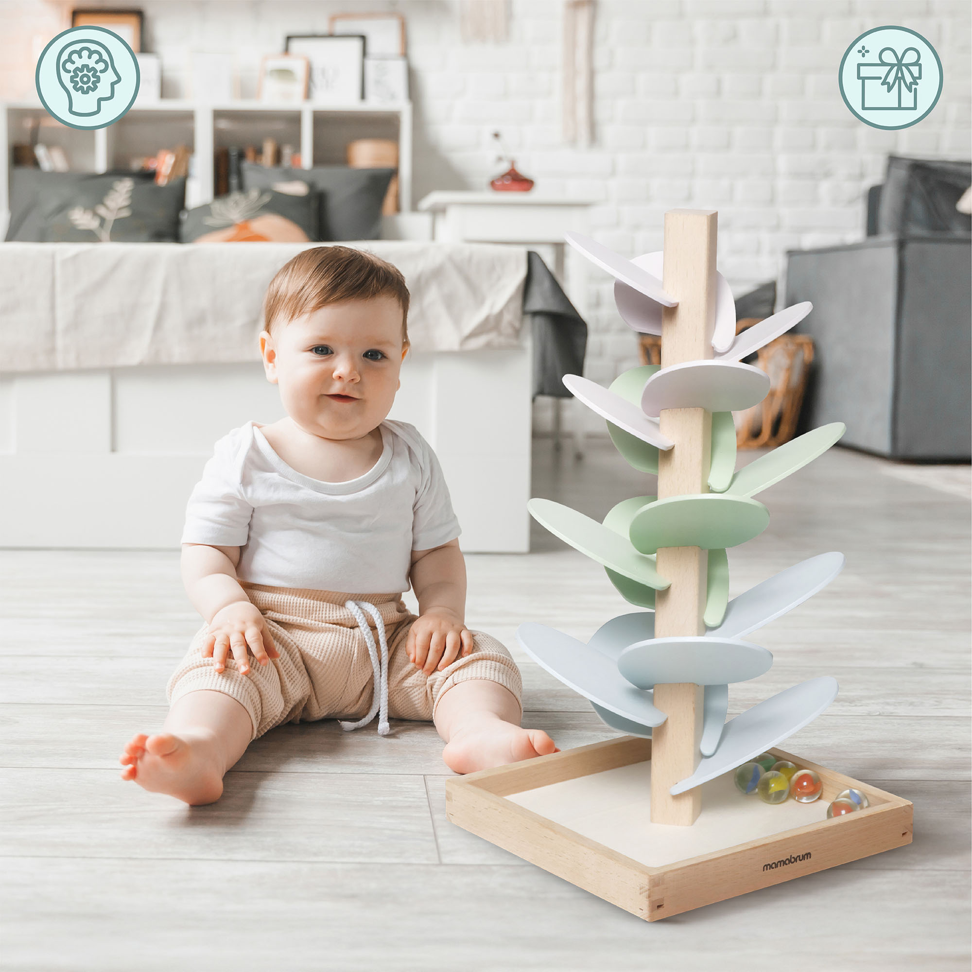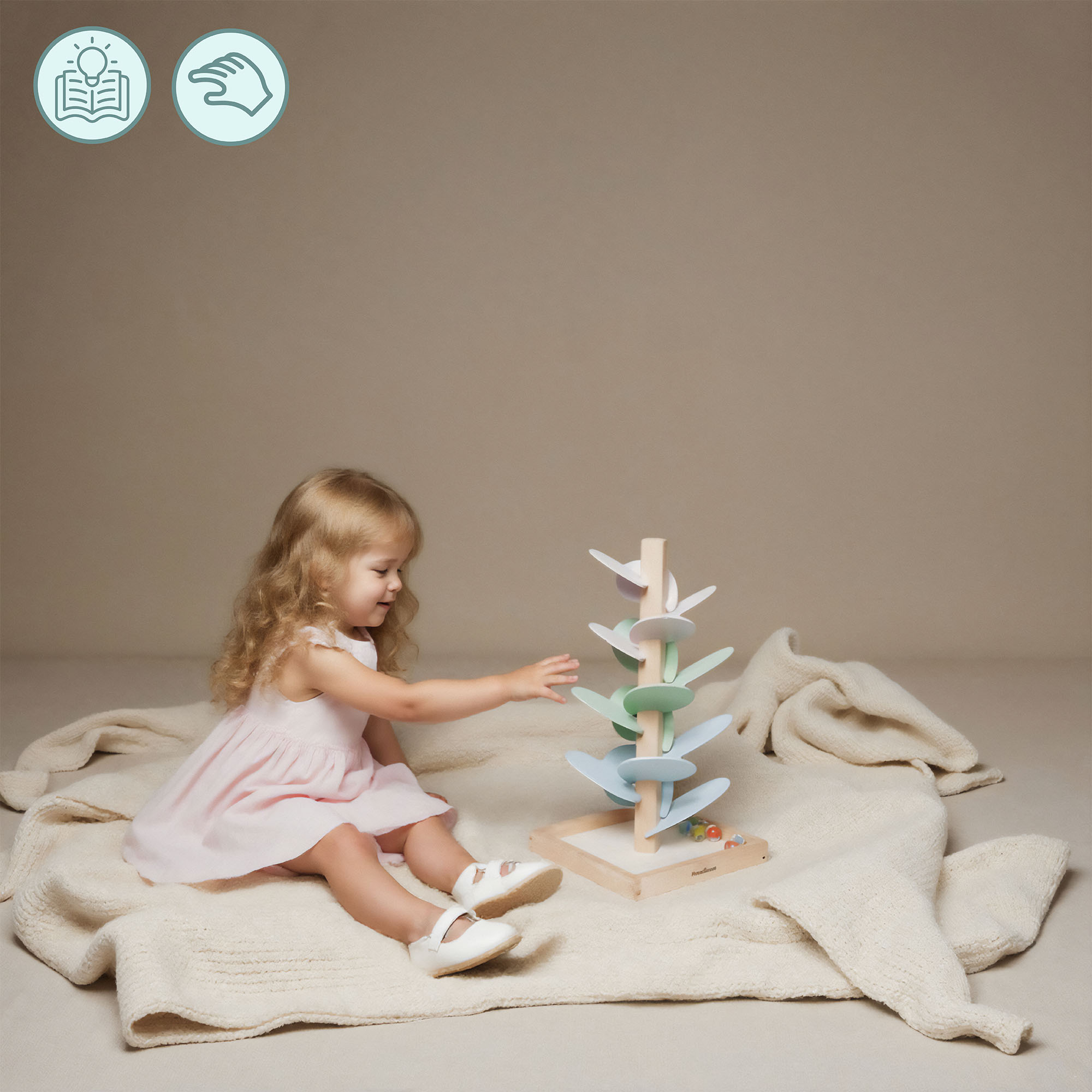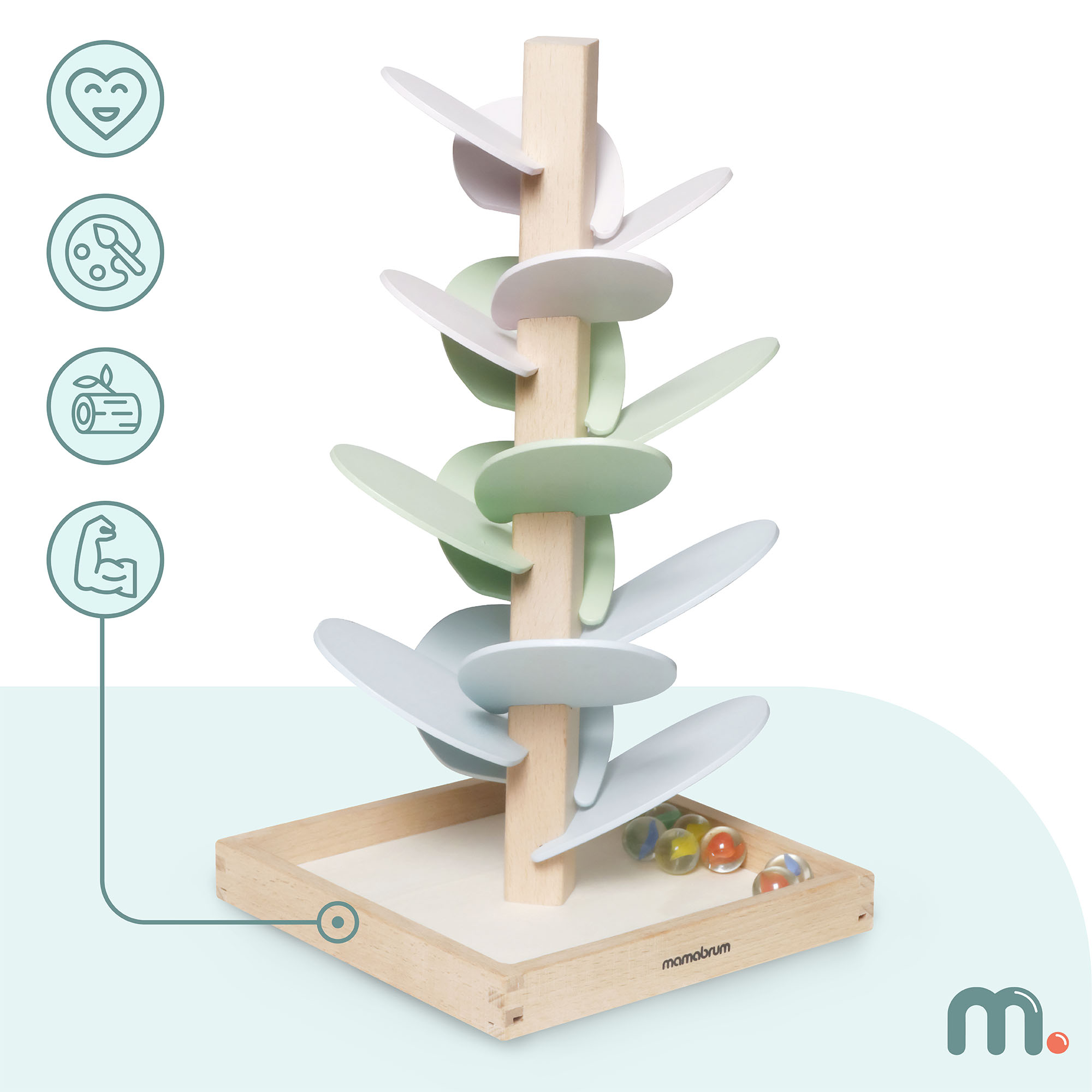 Το ξύλινο δέντρο θα γίνει μια μοναδική διακόσμηση για το παιδικό δωμάτιο, φέρνοντας ηρεμία και μια νότα μαγείας στο δωμάτιο. Τα παστέλ χρωματιστά φύλλα ενθουσιάζουν με την απαλότητά τους, ενώ οι διάφανες μπάλες με χρωματιστό κέντρο προσθέτουν ένα μοναδικό οπτικό αποτέλεσμα στο σύνολο. Το παιχνίδι διδάσκει την υπομονή, τη συγκέντρωση και τον συντονισμό, ενώ παράλληλα έχει καταπραϋντική επίδραση για να προάγει την ηρεμία του παιδιού. Είναι το ιδανικό δώρο που συνδυάζει την ανάπτυξη με το δημιουργικό και διασκεδαστικό παιχνίδι.