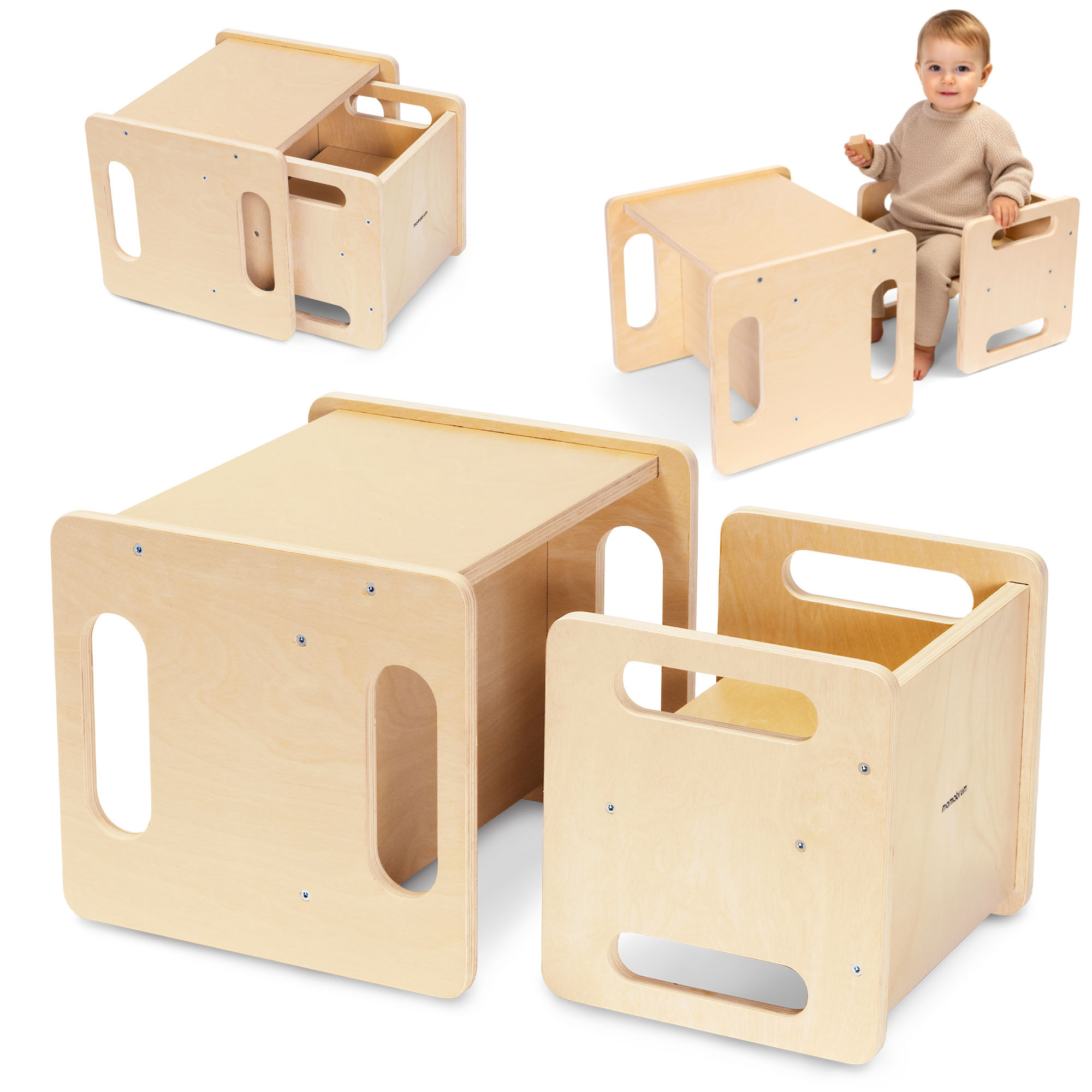 Αυτό το έξυπνο σετ παιδικών επίπλων συνδυάζει έξι πρακτικές χρήσεις , προσαρμόσιμες στην ηλικία και τις ανάγκες του μικρού σας. Απλώς αντιστρέφοντας τα κομμάτια, το τραπέζι μετατρέπεται από χαμηλό σε ψηλό τραπέζι και η καρέκλα από κλασικό κάθισμα σε άνετο σκαμπό. Επιπλέον, και τα δύο κομμάτια μπορούν να χρησιμοποιηθούν ως σκαλοπάτι, ενισχύοντας την ανεξαρτησία του παιδιού σύμφωνα με τη φιλοσοφία Montessori.