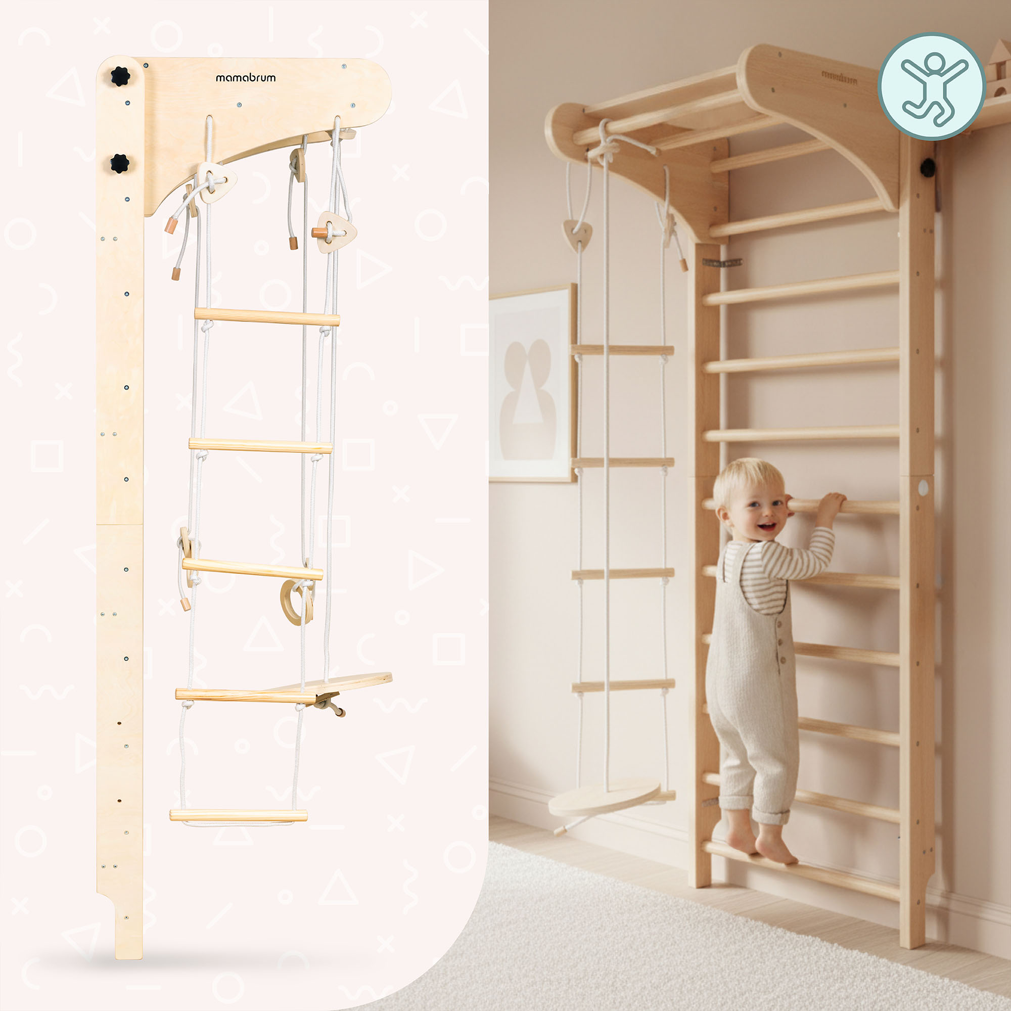 Ξύλινη γυμναστική σκάλα για παιδιά με αξεσουάρ - κούνια πιάτου, γυμναστικοί κρίκοι και σκάλα από σχοινί