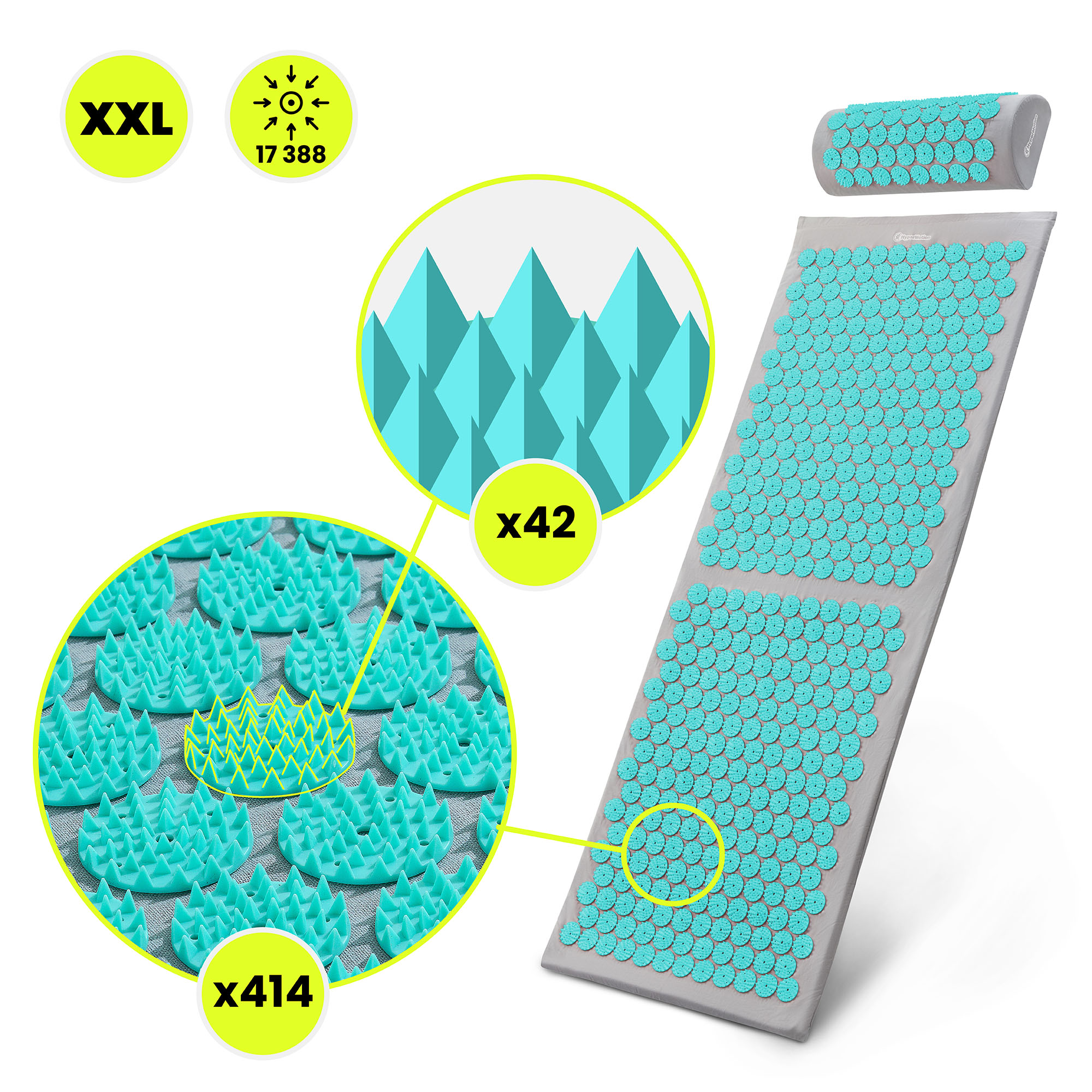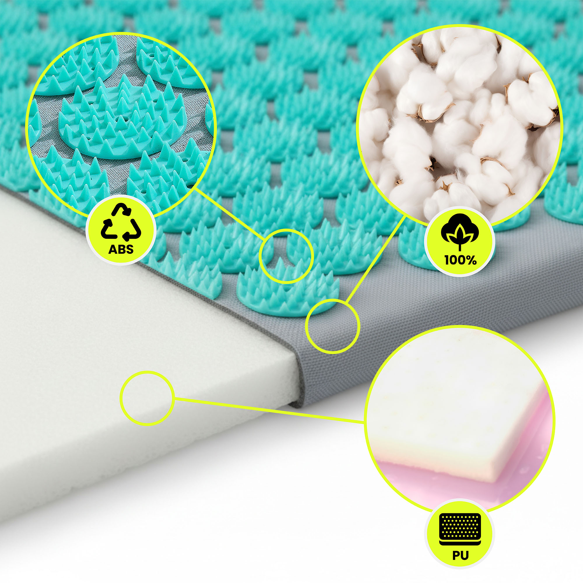Κάθε στοιχείο του σετ έχει σχεδιαστεί με γνώμονα την άνεση και την καθημερινή χρήση. Τα καλύμματα του χαλακιού και των μαξιλαριών είναι κατασκευασμένα από φυσικό 100% βαμβάκι , το οποίο είναι απαλό στην αφή και παρέχει ευχάριστη επαφή με το δέρμα, ενώ το εσωτερικό είναι γεμάτο με εύκαμπτο αφρό για σταθερή στήριξη . Οι ανθεκτικές πλαστικές αιχμές έχουν στρογγυλεμένες άκρες με ασφάλεια, παρέχοντας απαλή αλλά αισθητή διέγερση. Μια ελαφριά, ανθεκτική στην τριβή θήκη μεταφοράς από νάιλον ολοκληρώνει το σετ.