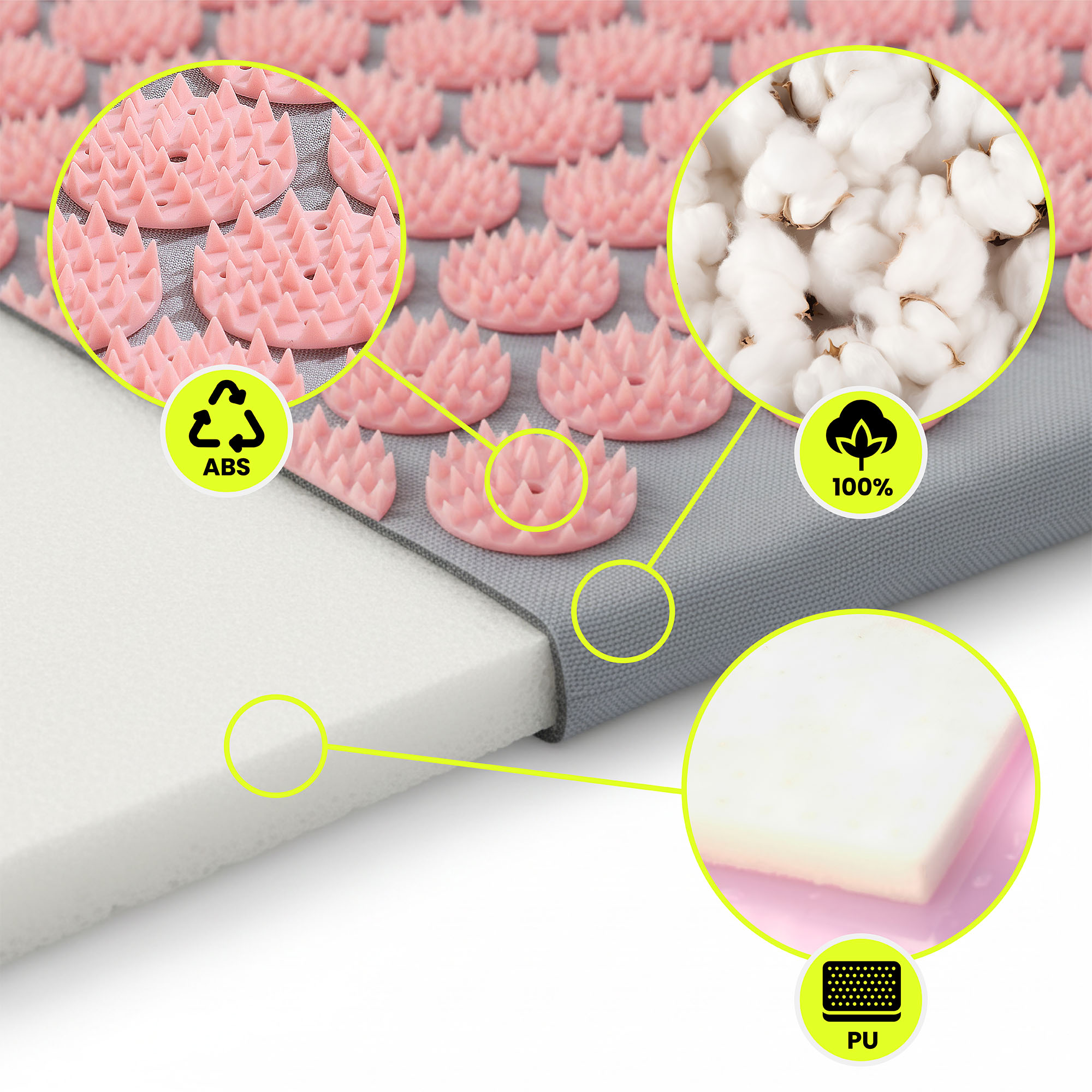 Κάθε στοιχείο του σετ έχει σχεδιαστεί με γνώμονα την άνεση και την καθημερινή χρήση. Τα καλύμματα του χαλακιού και των μαξιλαριών είναι κατασκευασμένα από φυσικό 100% βαμβάκι , το οποίο είναι απαλό στην αφή και παρέχει ευχάριστη επαφή με το δέρμα, ενώ το εσωτερικό είναι γεμάτο με εύκαμπτο αφρό για σταθερή στήριξη . Οι ανθεκτικές πλαστικές αιχμές έχουν στρογγυλεμένες άκρες με ασφάλεια , παρέχοντας απαλή αλλά αισθητή διέγερση. Μια ελαφριά, ανθεκτική στην τριβή θήκη μεταφοράς από νάιλον ολοκληρώνει το σετ.