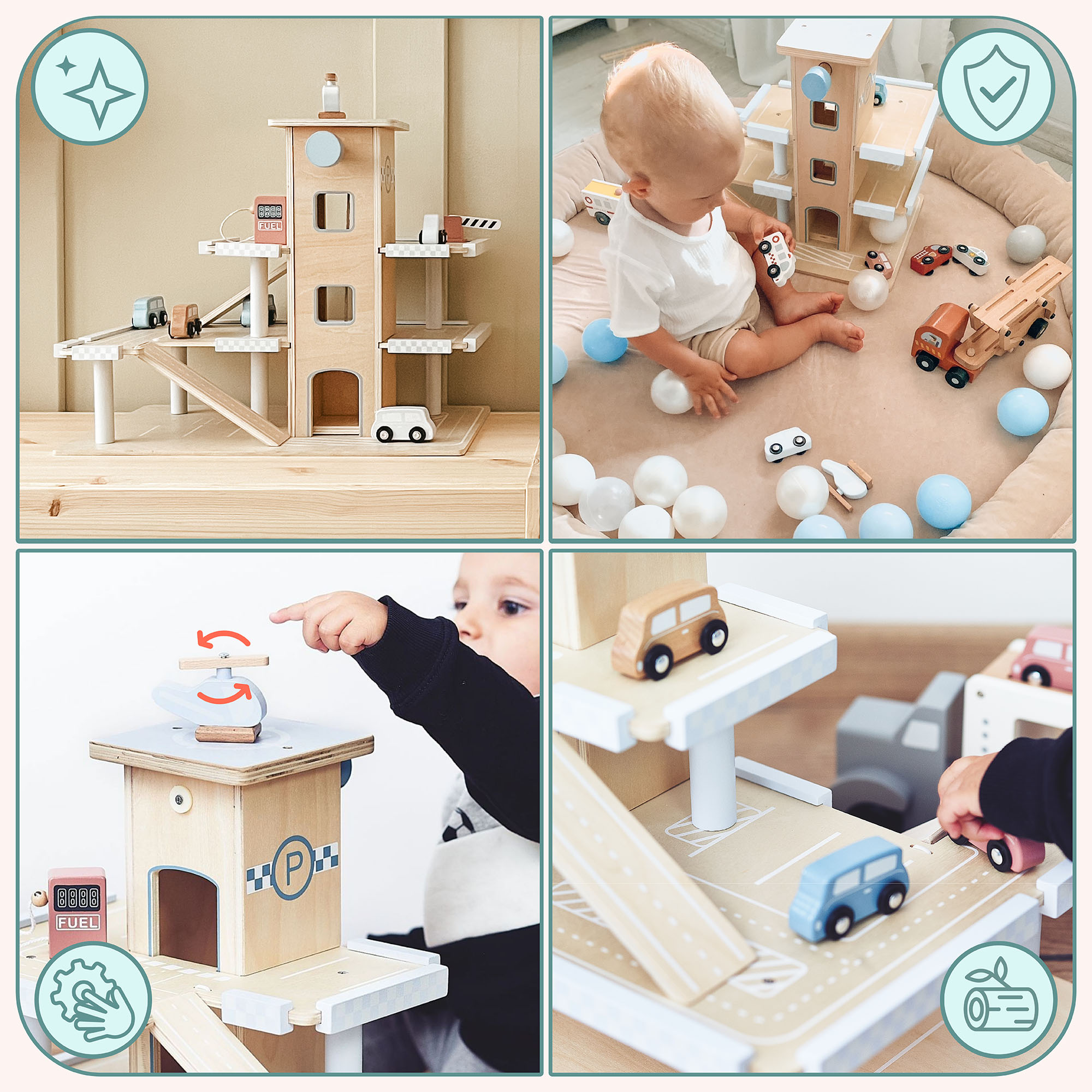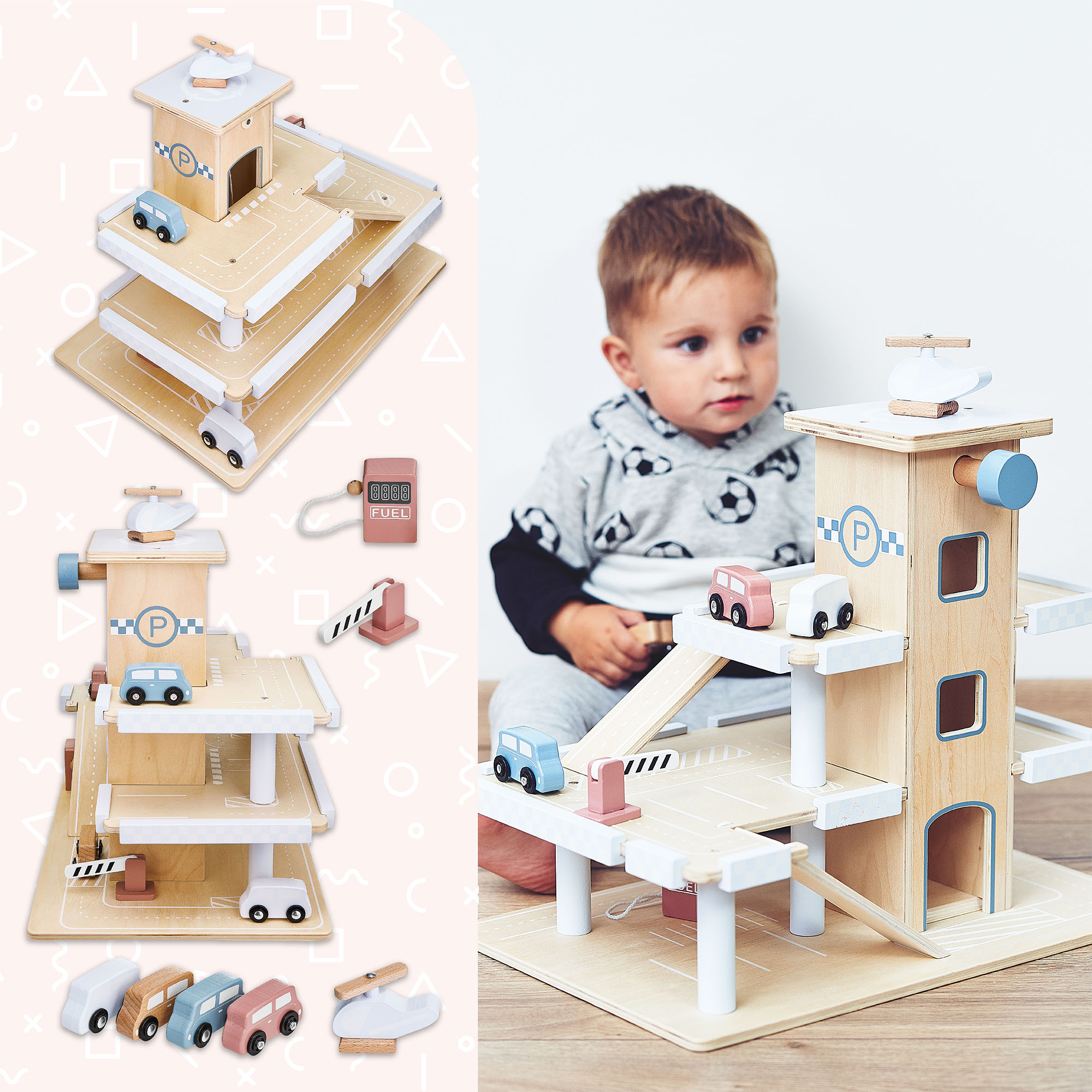 Το γκαράζ έχει τρία επίπεδα και μια τσουλήθρα. Όσο δημιουργικό μπορεί να παίξει ένα παιδί με ένα ξύλινο παιχνίδι. Ενώ παίζει, το παιδί εξασκεί το συντονισμό ματιού-χεριού. Το παιχνίδι είναι κατασκευασμένο από ξύλινο κόντρα πλακέ υψηλής ποιότητας, τα αξεσουάρ είναι βαμμένα με οικολογικά χρώματα.