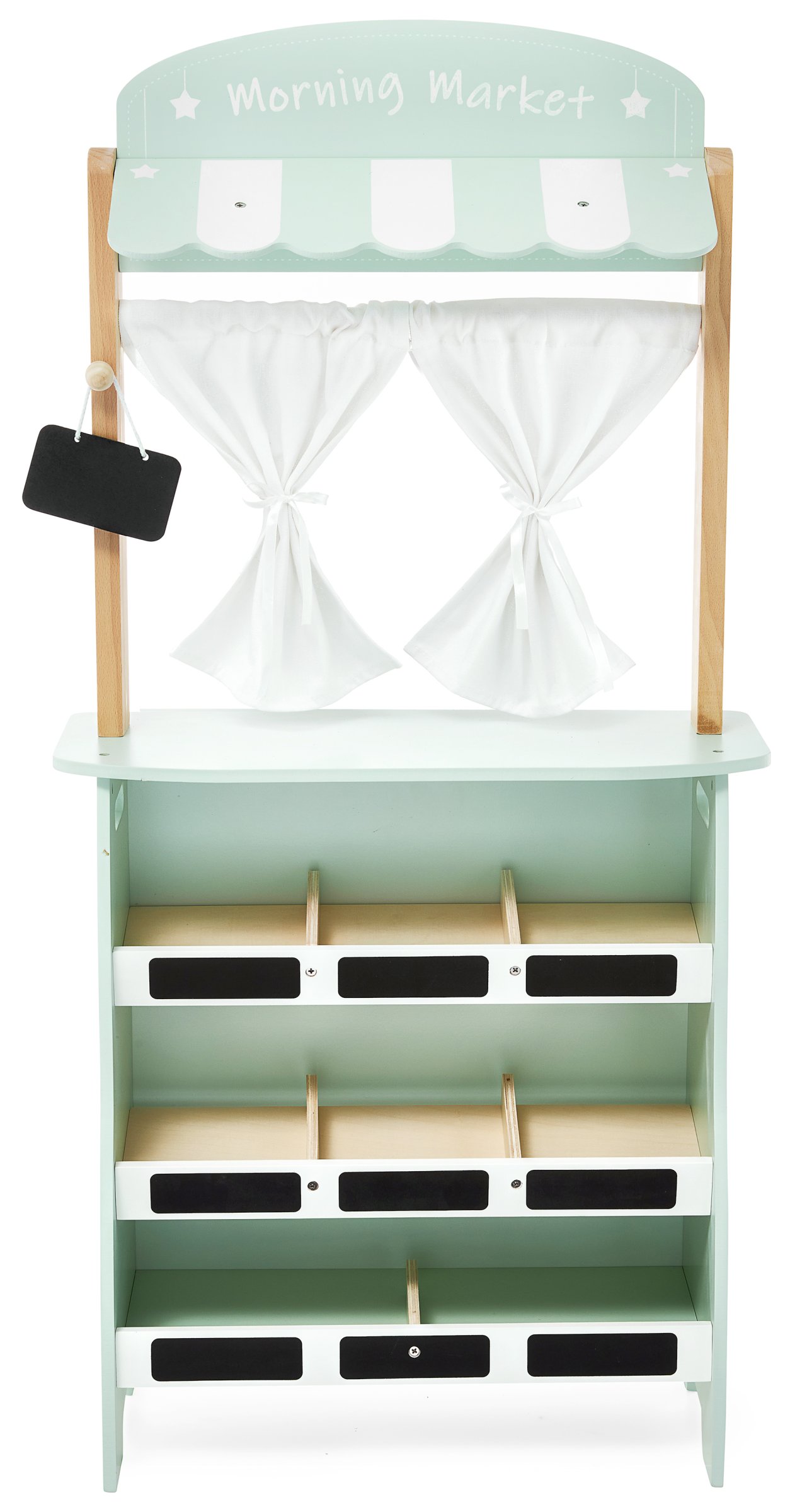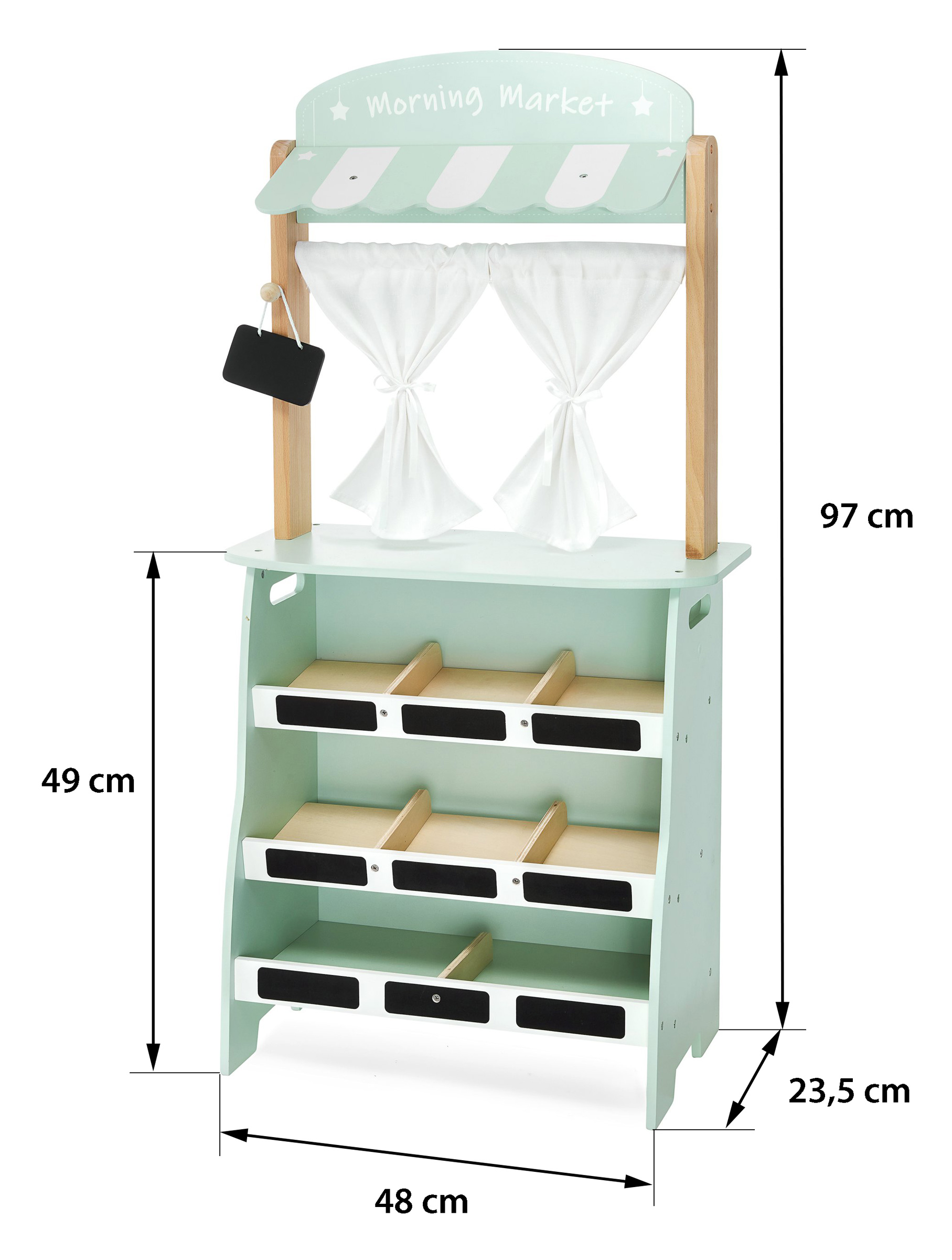 Το παιχνίδι απεικονίζει έναν πάγκο λαχανικών στη μία πλευρά, διακοσμημένο με μια γοητευτική τέντα και ντελικάτες κουρτίνες. Ο μικρός πωλητής έχει μια κινητή ζυγαριά, ένα τερματικό με κάρτα πληρωμής και 16 κομμάτια φρούτων και λαχανικών όπως καρότα, μπανάνες, ντομάτες, μανιτάρια, αχλάδια, λεμόνια σκόρδα ή ζουμερά μήλα. Κάθε λαχανικό ή φρούτο αποτελείται από δύο μισά που συνδέονται με Velcro, ώστε να μπορούν να κοπούν και στη συνέχεια να συναρμολογηθούν ξανά. Κάτω από τον πάγκο υπάρχουν 8 διαμερίσματα που μπορούν να φέρουν ετικέτες με τις τρέχουσες τιμές. Μην ξεχάσετε να γράψετε τις σημερινές προσφορές σε έναν ειδικό πίνακα!